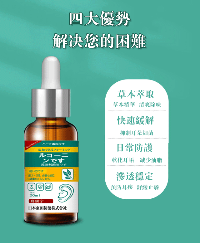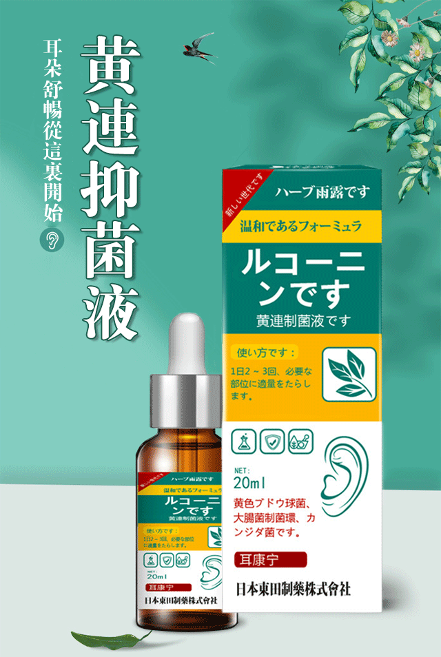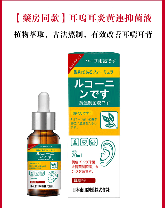 日本東田制藥株式會社的耳康寧中耳炎耳鳴耳聾黃連抑菌液,植物萃取,老中醫古方調配,耳鳴一用就停,耳聾一滴就好,純天然中藥精製而成,改善耳癢軟化耳屎,見效快,吸收好。